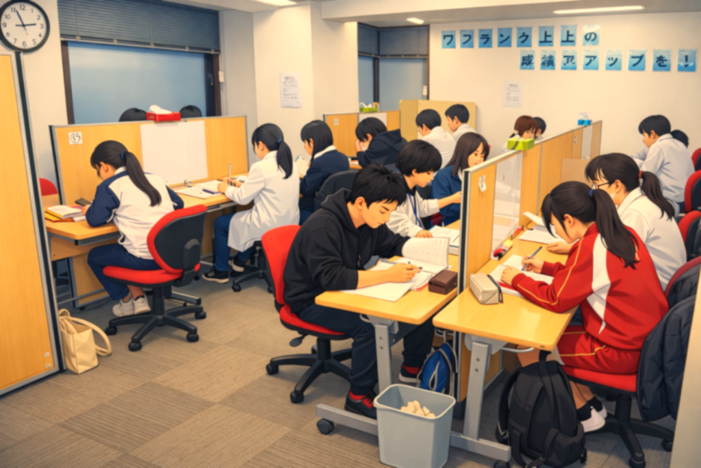 空いている日や空いている時間帯はブースがいくつか埋まる程度ですが、混んでいるときは先生と生徒でブースが埋まります。