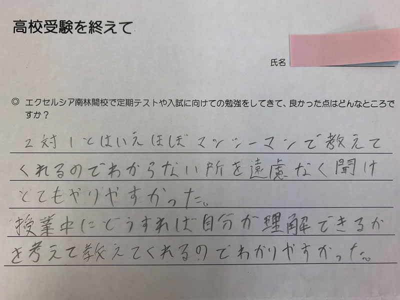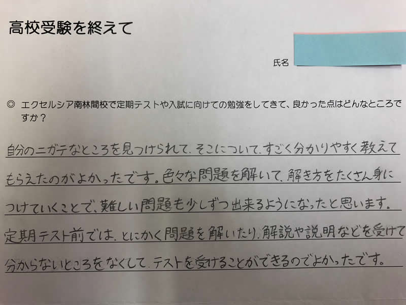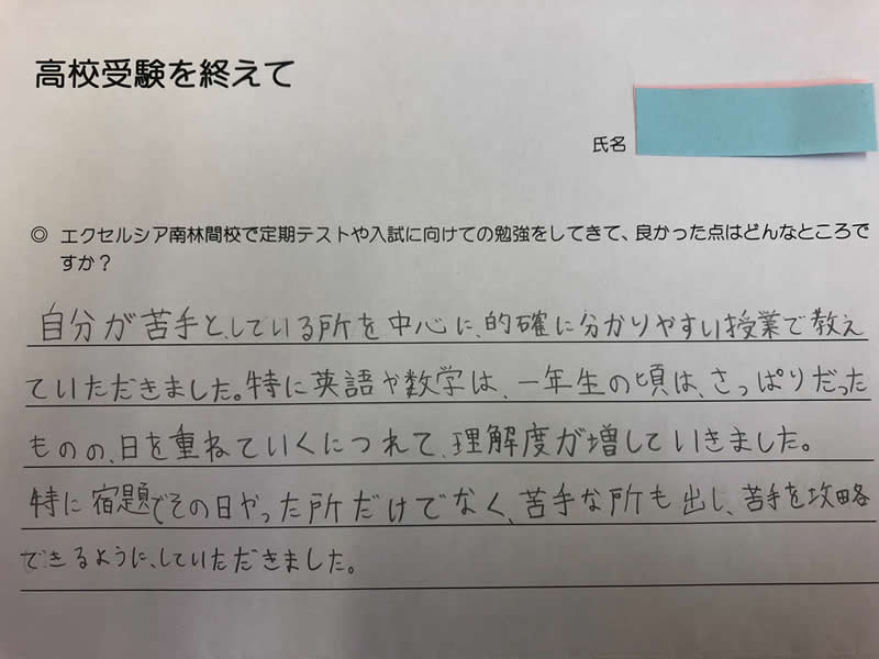 個別指導エクセルシアの魅力の1つは成績が上がることです。大きな成果を生み出すために小さな成功を積み重ねていきます。その結果、内申・成績アップを果たしたお子さんが多くいらっしゃいます。ほんの一部ではありますが、その喜びの声をお伝えします。